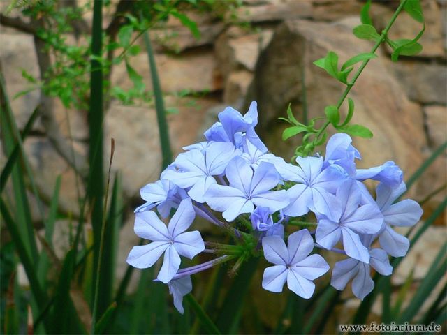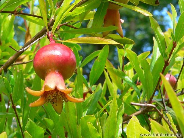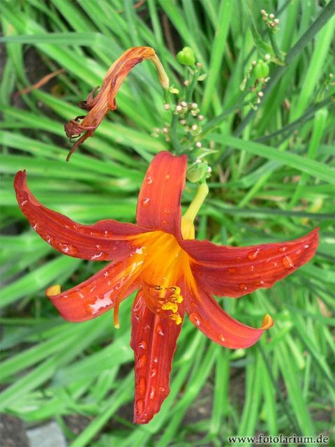 Rote Lilie mit Tropfen Blaue Blüten Kleiner Granatapfel Dünne Zweige vor Mauer